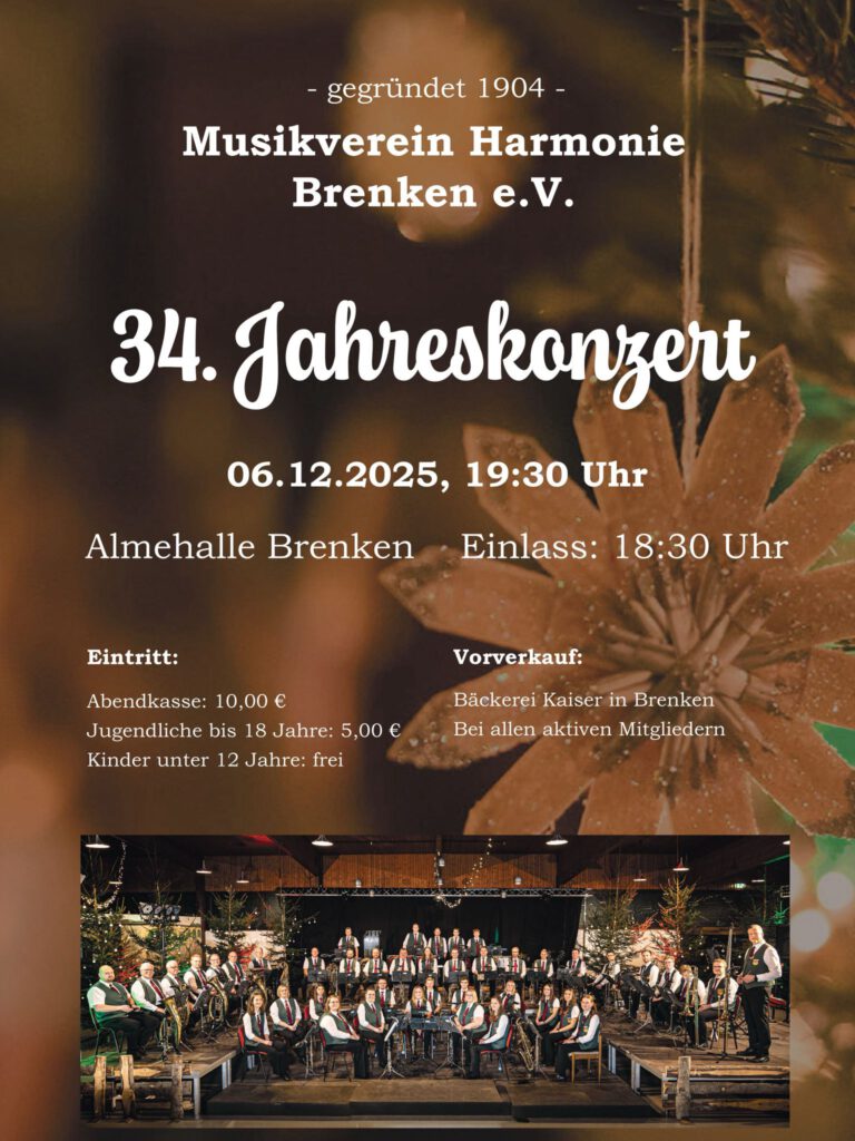 Am 06.12.2025 um 19:30 Uhr öffnet die Brenkener Almehalle ihre Tore für das Jahreskonzert des Musikvereins Brenken – Einlass ist ab 18:30 Uhr.